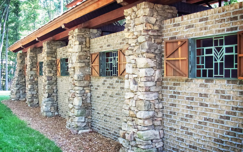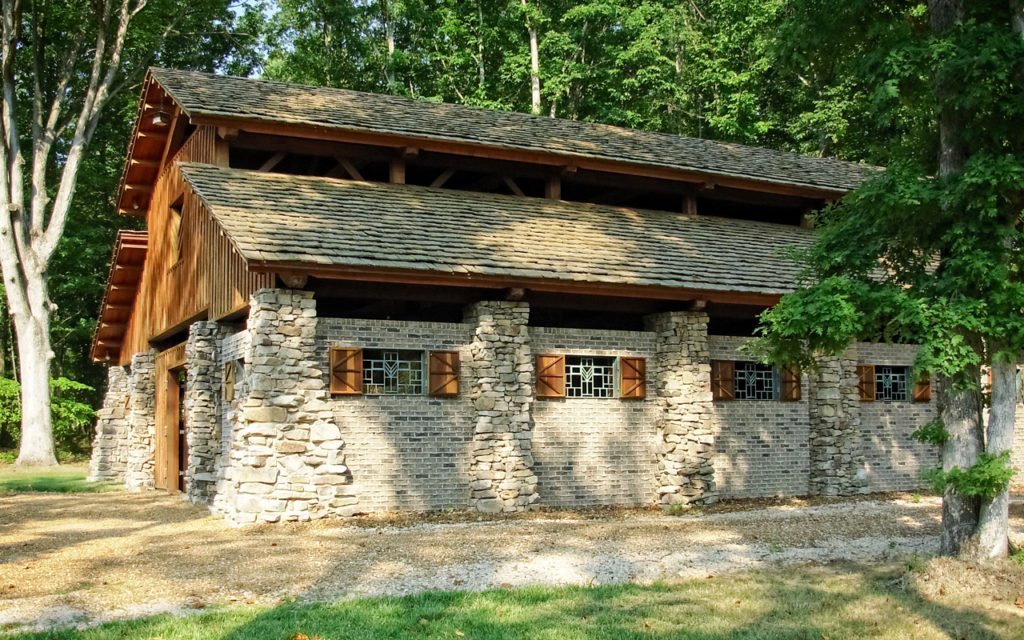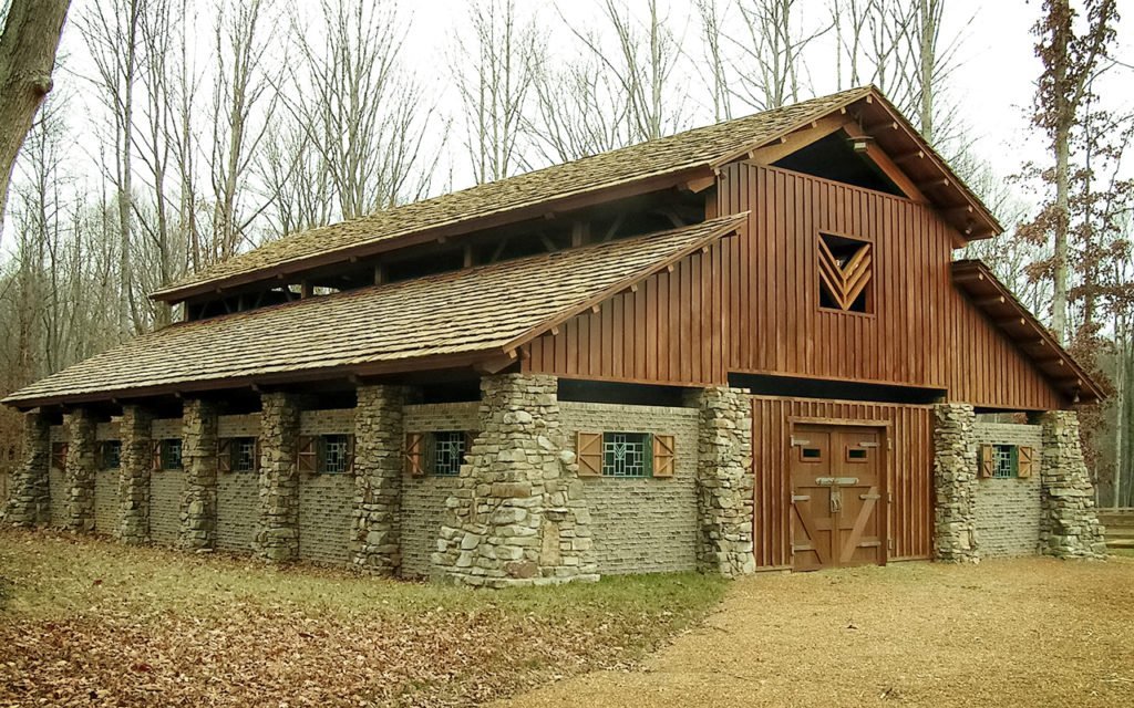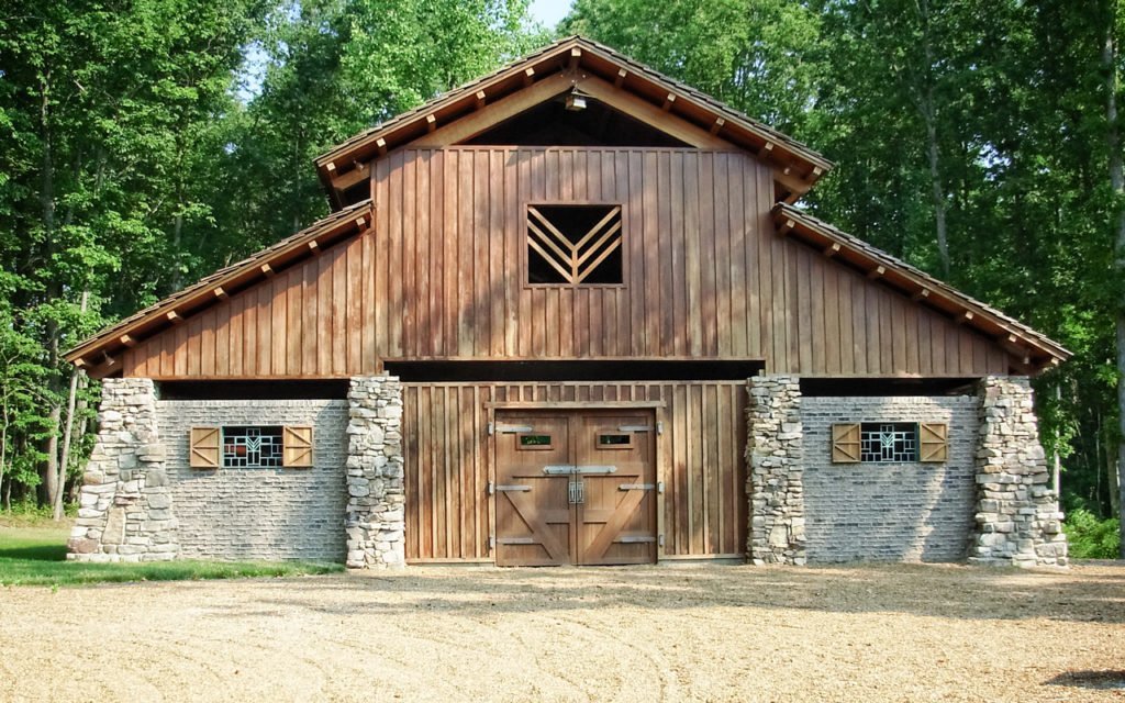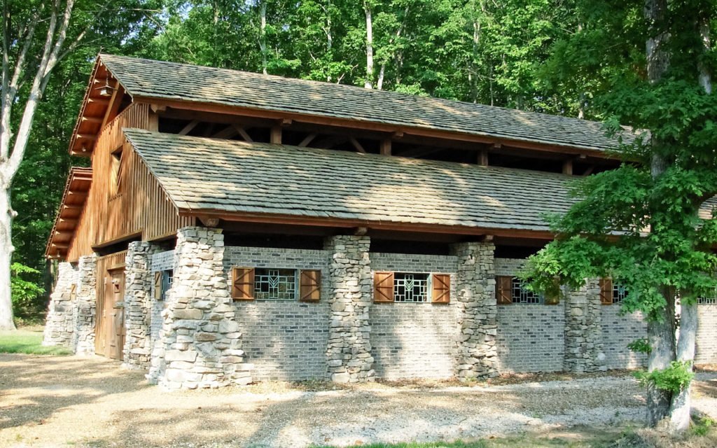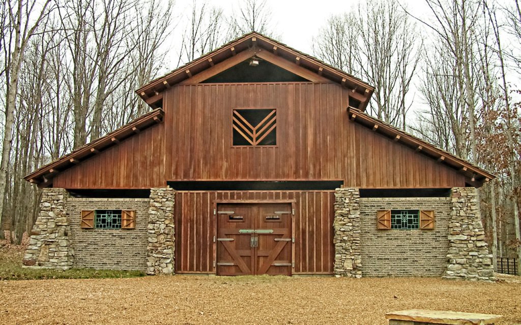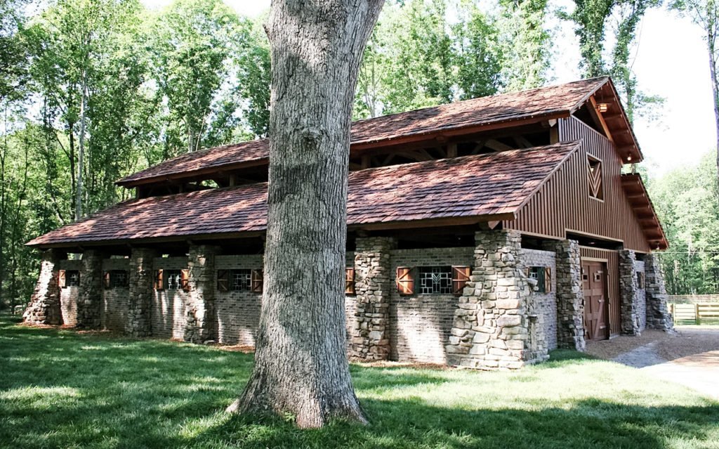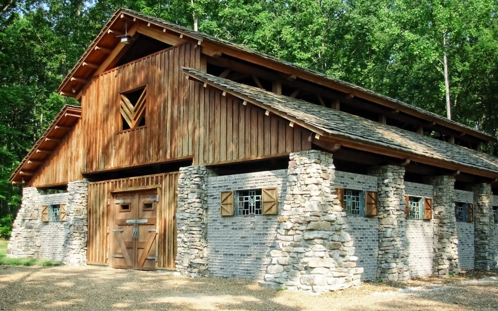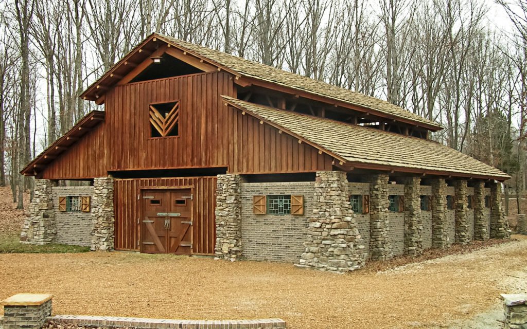 A client in Tennessee commissioned an elegant 3900 sq. ft. horse barn, for which ATF used a combination of natural stone and Brazilian timbers, including sapucaia, angelim pedra, goncalo alves and massaranduba. The barn comprises eight stalls plus a tack room and an upper gallery. Hand-split exotic hardwood shakes cover the roof.